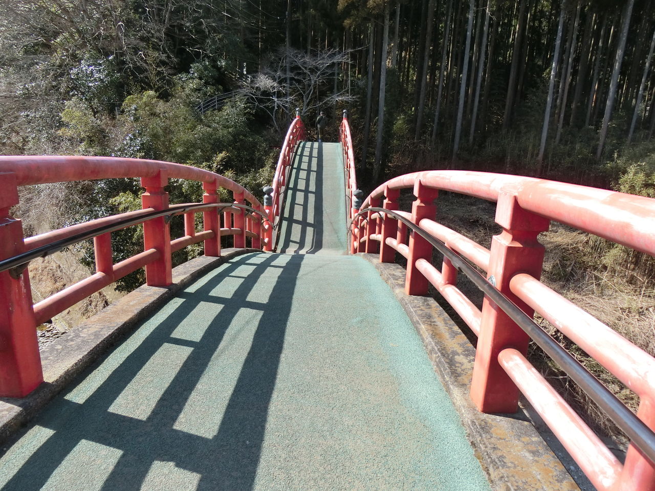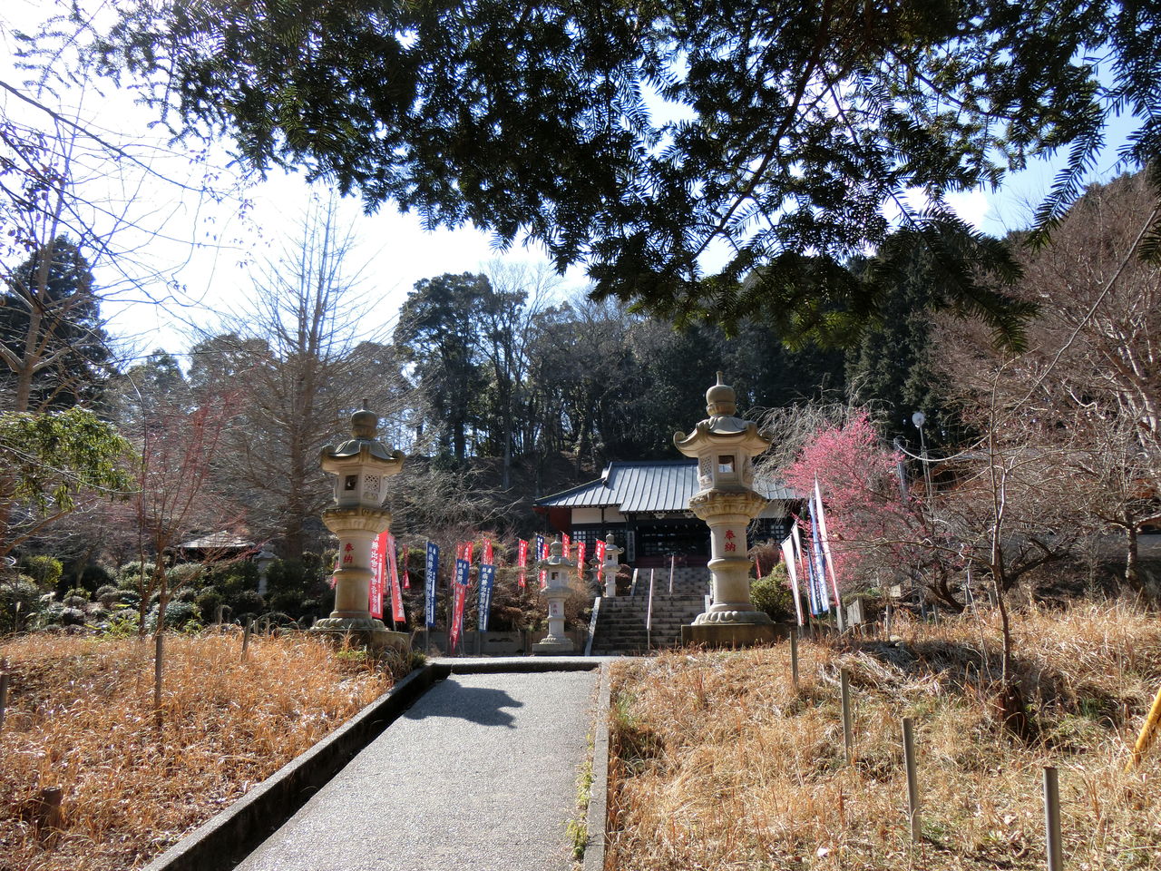 朱色の太鼓橋を渡りながら、登り道を歩いて約10分程すると、